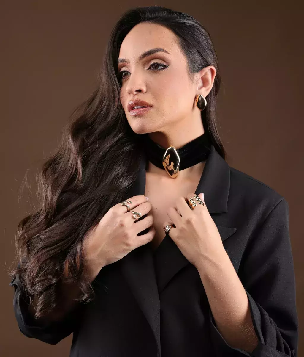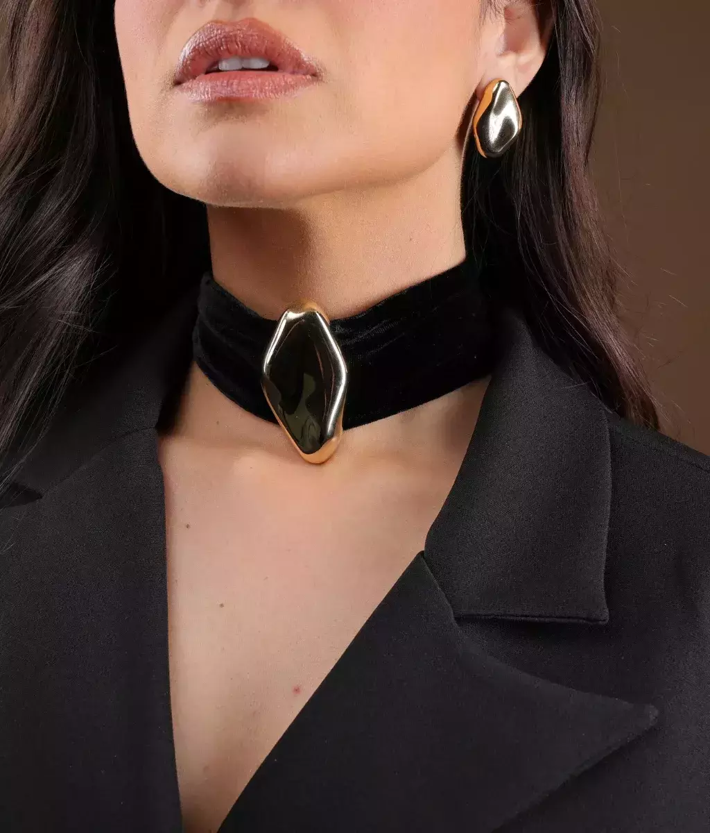 Uma peça que fala por si. Esta Choker lenço em camurça preta é pura expressão de sofisticação e presença. O toque aveludado do tecido envolve o pescoço com sensualidade e conforto, enquanto o medalhão orgânico com banho em ouro 18k impõe um brilho natural e poderoso. Extremamente elegante e de estética maximalista, este colar transforma qualquer look com sua força visual. Não precisa de complementos: ele é o destaque. Ideal para produções noturnas, eventos especiais ou para elevar o visual com uma única peça de impacto e com o brinco, o conjunto fica completo!