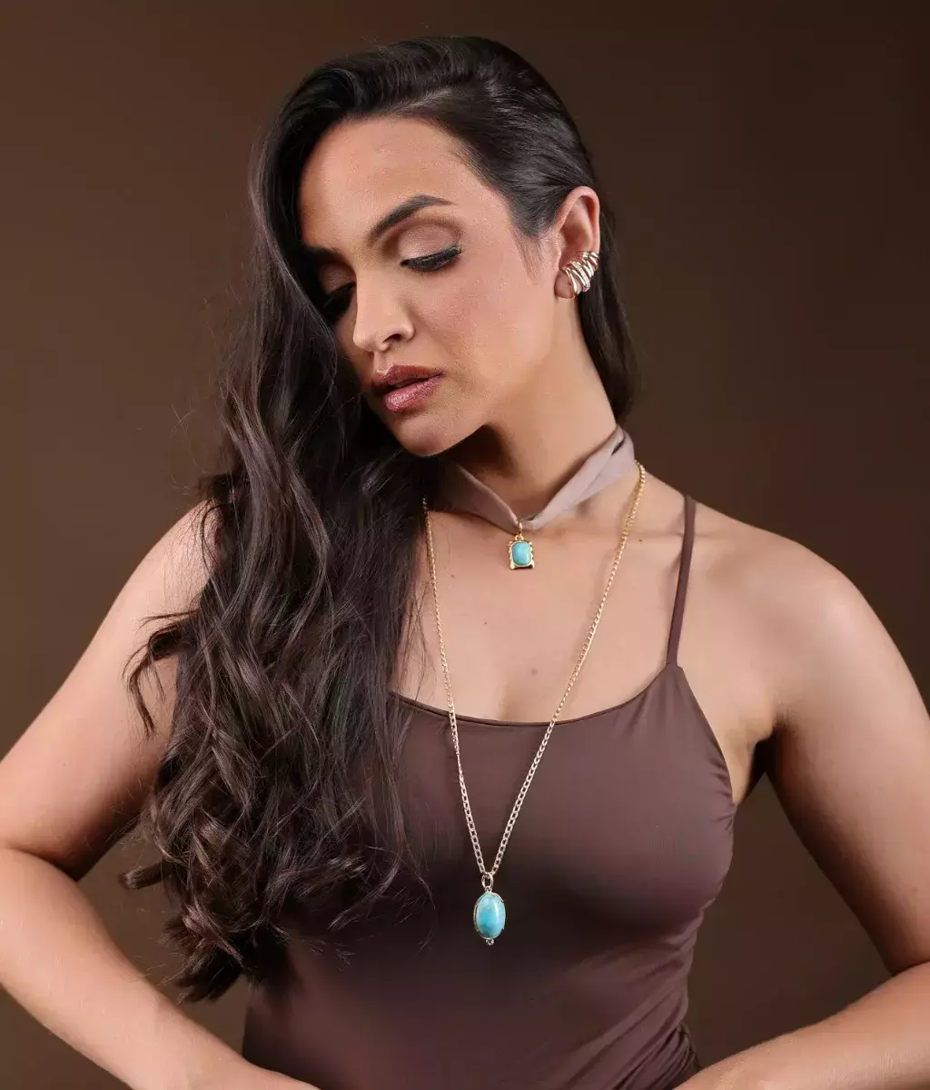 Com 80 cm de puro charme, seu comprimento alongado valoriza decotes profundos, mas também cria contraste sofisticado com blusas de gola alta. Versátil por natureza, pode ser usado em duas voltas, transformando-se em um colar estilo chocker e renovando completamente a proposta do visual — do boho chic ao clássico moderno. A pedra turquesa, símbolo de proteção e força, adiciona cor, energia e personalidade a qualquer produção.